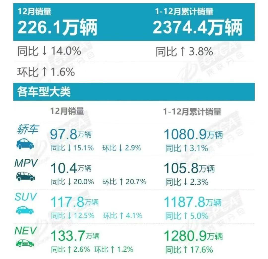 据中国汽车流通协会乘用车市场信息联席分会最新销量数据统计,2025年全年累计销量为2374.4万辆,同比增长3.8%。其中,新能源汽车全年销量为1280.9万辆,同比增长17.6%。按车型种类统计,轿车全年销量为1080.9万辆,同比增长3.1%;SUV全年销量为1187.8万辆,同比增长5%;MPV全年销量为105.8万辆,同比下跌2.3%。
